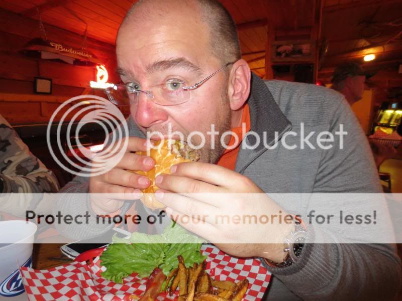 My brother taking on a bacon double cheeseburger
