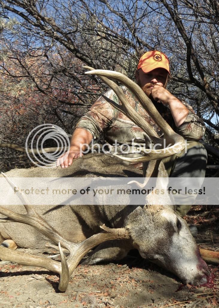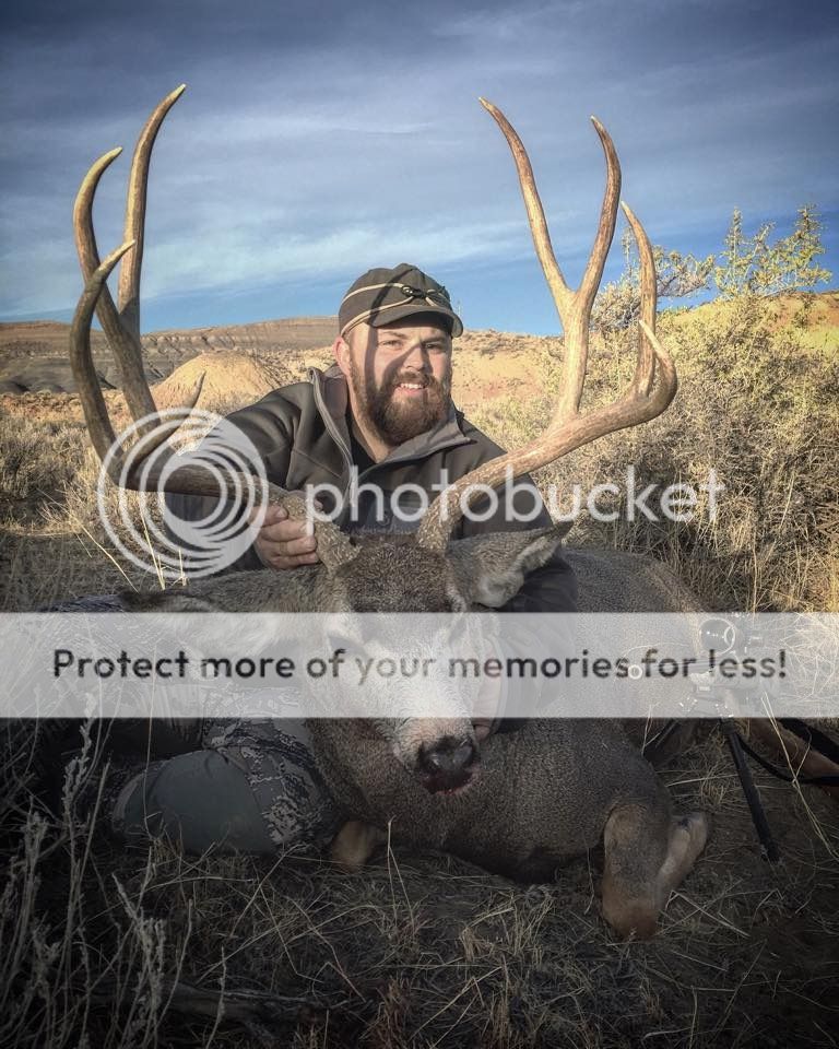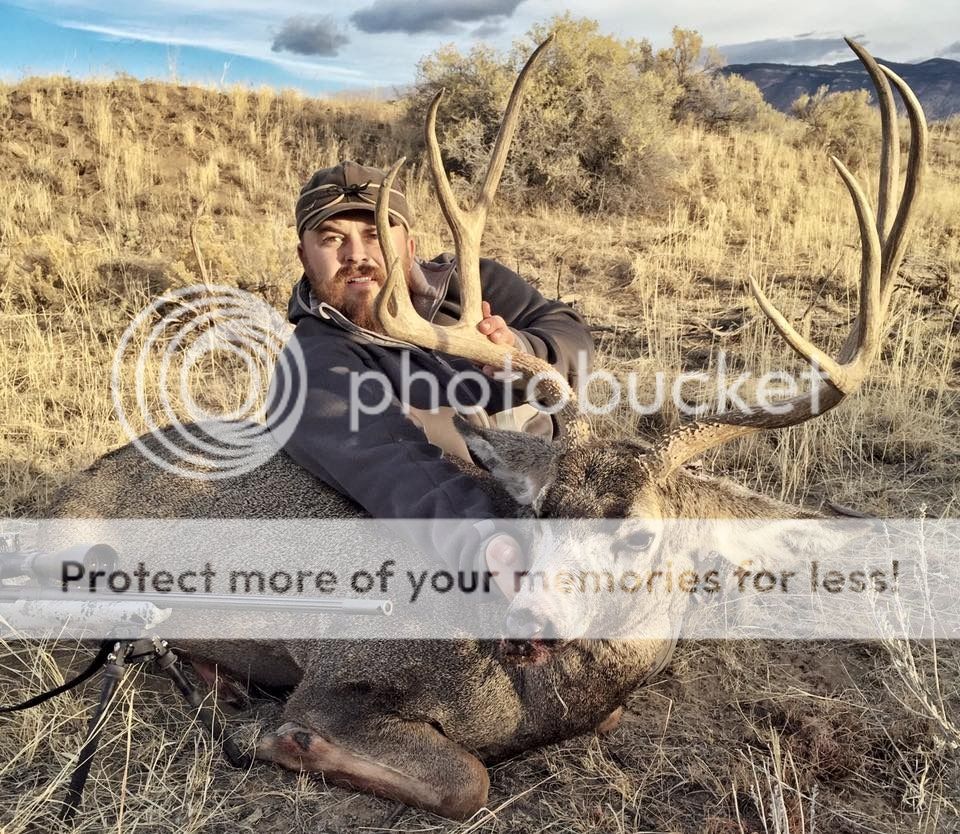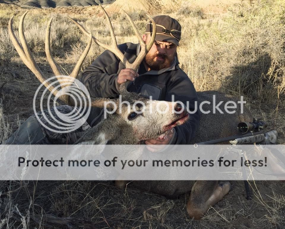 Good plan bad timing, I bailed off after him and we barely missed running face on into each other. When I stopped where I thought I would be 200 yards above him he was already 200 past me and we saw each other at the same time. dad called out the range but he was already gone at a dead run I got down on my bipod and he came out at 375 for a quick second and I sent a 180 right through his rib cage. he jumped and kicked and took off he made it down and across one more draw and dad called out 534 he was probably going to lay down right there but I wasn't chancing it. 2 MOA for wind as he was standing straight away and on an up hill grade the second 180 hit perfect right behind the shoulder blades and busted his spine. He was out like a light.
