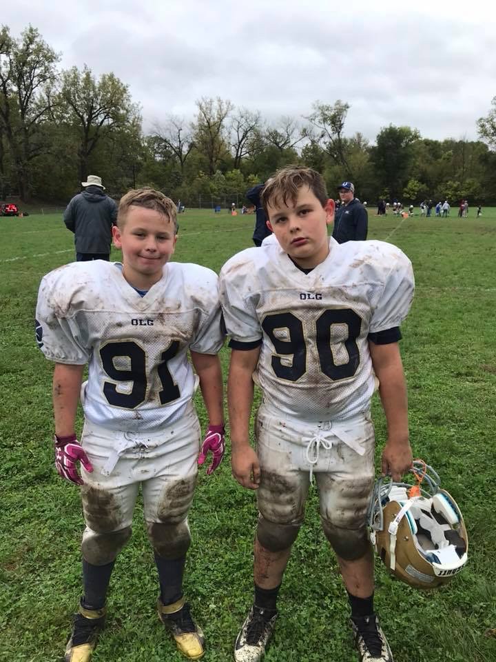 Rules limit them to being linemen, but today it was sloppy and the linemen had fun!!! They both had fumble recoveries, lots of tackles, and did well blocking. #90 was most excited about kicking his first extra point!
