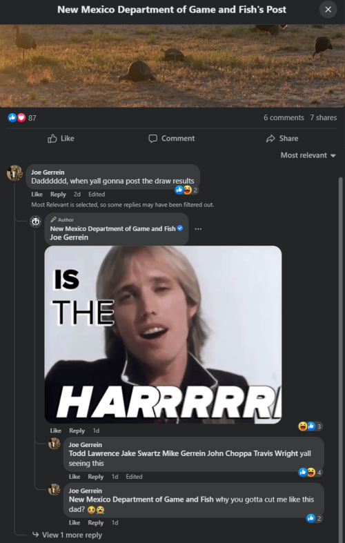 This is great. Fantastic replies on there.I'm pretty sure NM G&F are just messing with us now. They just posted about wood ducks on their facebook page; like that's what we're all dying to read about.
