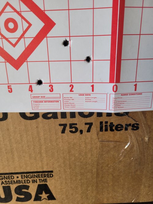 Got it out again today and after shooting some at 200 yards I moved out to 300 for this group. Not sure why it stepped out to the left like that but I'll work on that later. Barrel was getting fairly warm. Drop was about what I had thought and when I dialed my scope up that group was around 2.5 inches low. Pretty close to the chart. Next session I'll break out the handloads and see how they work out.