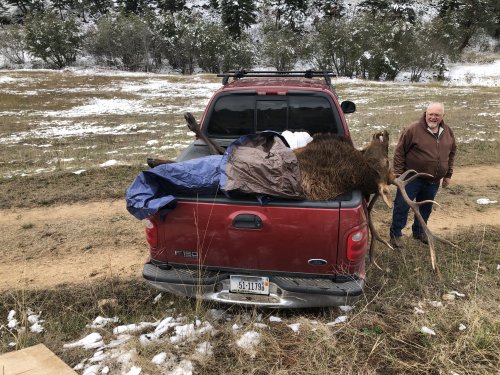 The bull died only 80 yards above the road. I called my dad to see if he wanted to come with me while I loaded it. He can’t do anything physical due to bad knees, but I was confident I could heave this bull into the truck alone. He was coming out whole and did. Icing on the cake with my dad.6120F343-4755-440D-ADC7-6DA0914B3F85.jpeg