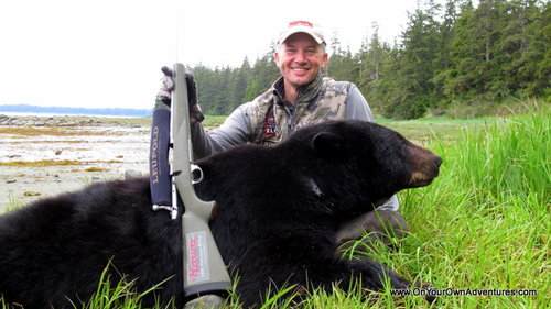 Brad tells me to get ready in case the bear gets up. I tell him, if the bear even moves, I am drilling him for good measure. No more than the thought crosses my mind and the bear somehow gets to his feet and quarters toward me. I put the crosshairs under his left armpit. I squeeze, and before I can regain my sight picture, the bear is completely prone, as if hit by lightning. He is on the tideline, in the wide open. I stay on him, ready to prevent any possible escape and need for tracking. He is done.