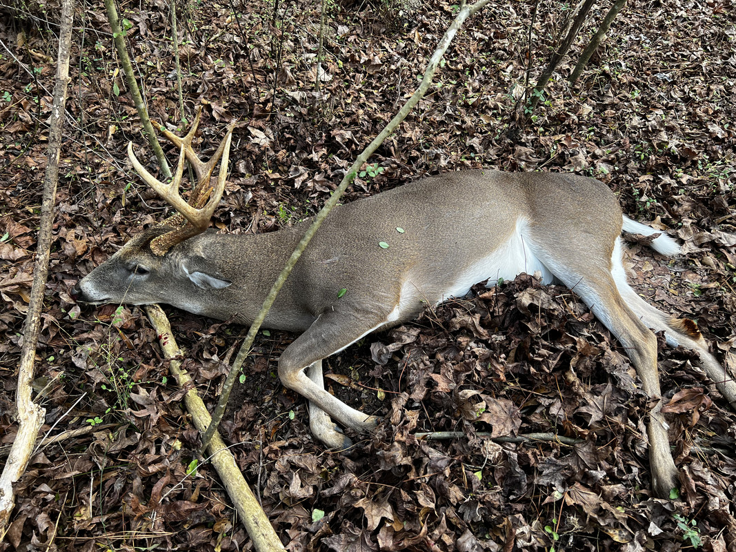 So I hurry over to their shooting house and Kasey is still crying, Emma is scared and there’s a dead buck in the field, a small 5 point.