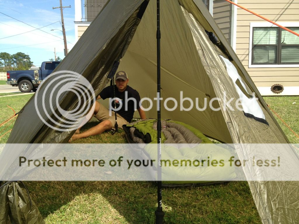 From setting it up in my yard I think my set-up has accomplished what I wanted it too...definitely roomier and, in fact, with the MegaTarp at 1 lb 5oz and the Big Agnes Heart Mountain at 2 lbs, I'm right at the same weight. The other great thing about the MegaTarp is that it lets me run a lightweight backpacking stove (I have an Ed T cylinder stove) that can greatly increase the comfort of the set-up when temps drop. I really like the flexibility that the tarp, bivy (if I choose to bring it), and bag set-up provides and after last year's backcountry hunt, I decided I wouldn't mind sacrificing a little weight to increase my comfort level. Here's a pic of me inside it...in fact there's room for two people and all their gear in it (in the Flycreek UL2 I had to leave nearly all of my gear outside as the vestibule isn't that big and there really isn't too much space on the inside.