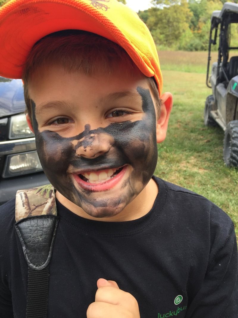 After getting it cleaned and in the freezer he asked that I let him know when it was 3pm as that's when he wanted to back out deer hunting. Mind you it's 80º so that's a bit early than I was planning on going but I'm not gonna argue. Since we had seen a deer out of the ground blind that morning that is where he wanted us to sit. I was getting a bit of gear ready and this is what happens when you leave an 8yo unsupervised with the face paint!