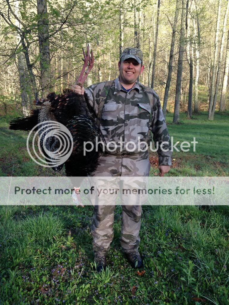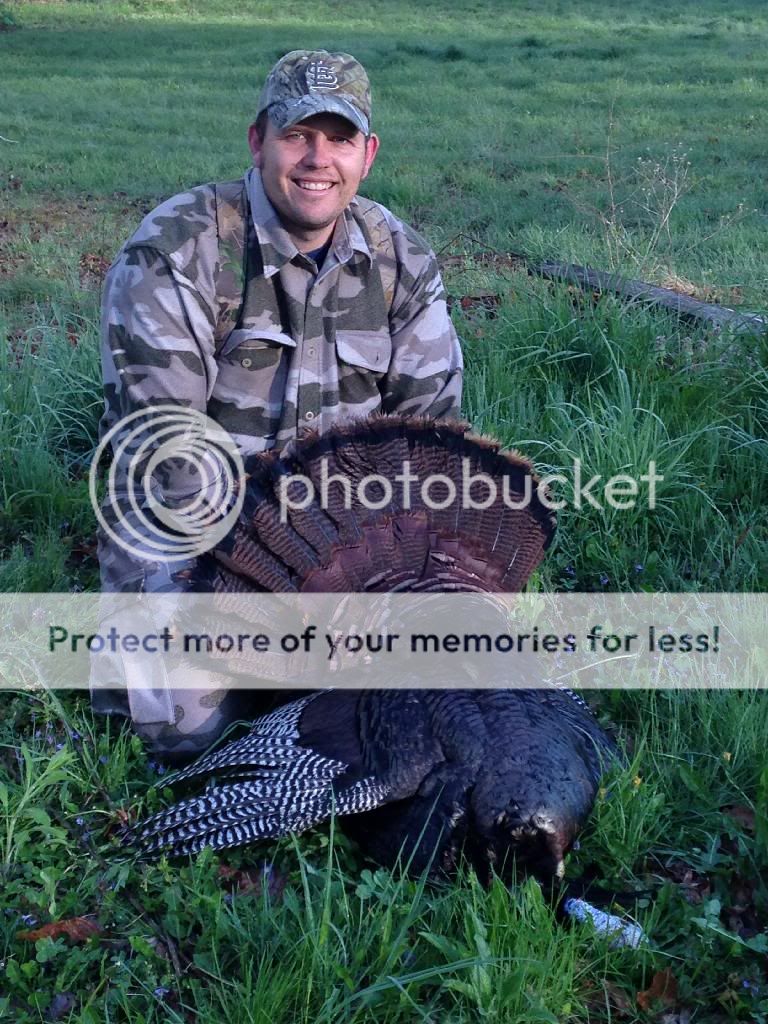 Saturday morning I headed to the NW corner of our property just as light was breaking. About 1/2 up the hill I hear 2 then 3 gobblers, with a 4th off in the distance to the west. I slow my pace up as I could tell they were close. Another gobble-fest and I look up and spot 3 of them still on the roost 65yds away. Fearing I'd spook them if I tried to get setup on the ground, I just stepped behind a tree and kept an eye on them by peaking around. It was fun watching them light off everytime something made a noise. Dogs bark, they gobble. Goose honks, they gobble. Truck drives by on the road 100yds away, they gobble. After about 15mins they fly down and I give a couple of yelps. They moved towards me a bit and take turns strutting, but they didn't gobble. They start heading away and to my right towards the field I was trying to get to, so I shot one. I was back at the cabin and drinking coffee just after 7am...