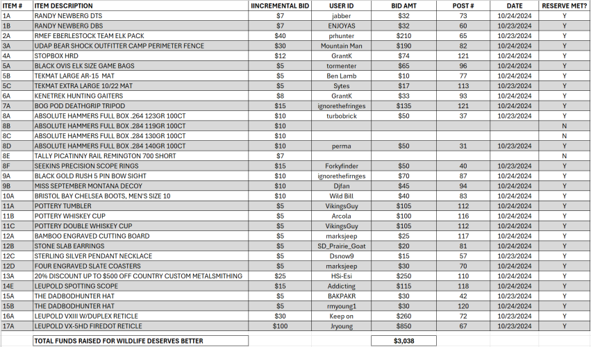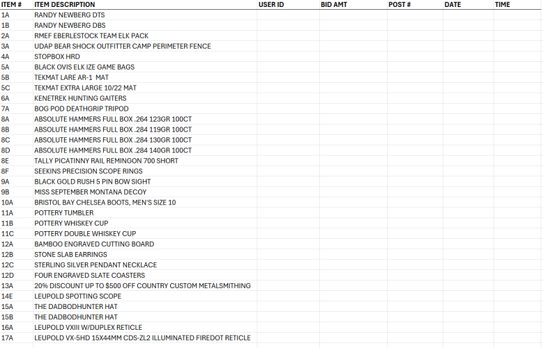 Excel sheet will be updated as often as possible. Due diligence is on bidders to view posts for highest bids on specific items.