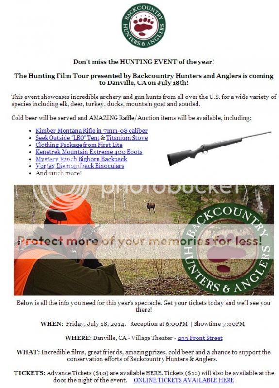 For those of in CA the California Chapter of Backcountry Hunters and Anglers will be hosting The Hunting Film Tour in Danville CA on July 18th, 2014.