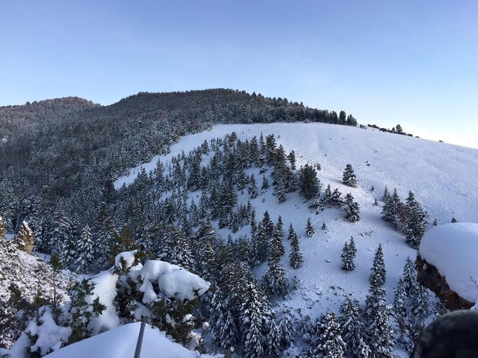 Frustrated Michael decides to look behind us and glass across the valley, where he spots 3 elk 2 miles away walking into some trees. We hop in the truck, haul ass to get as close as we can for a better look. By the time they entered the trees all we could tell was that they had big frames and walked like mature bulls, but it was the best opportunity yet. They walked into the big patch of timber in the middle of the pic. The plan was set for me to leave the truck at about 1, hike up and get into shooting position by 3 and hope that they would feed out in the same spot come evening. Like they usually do in this unit.