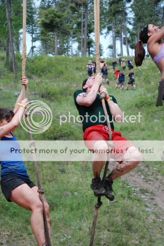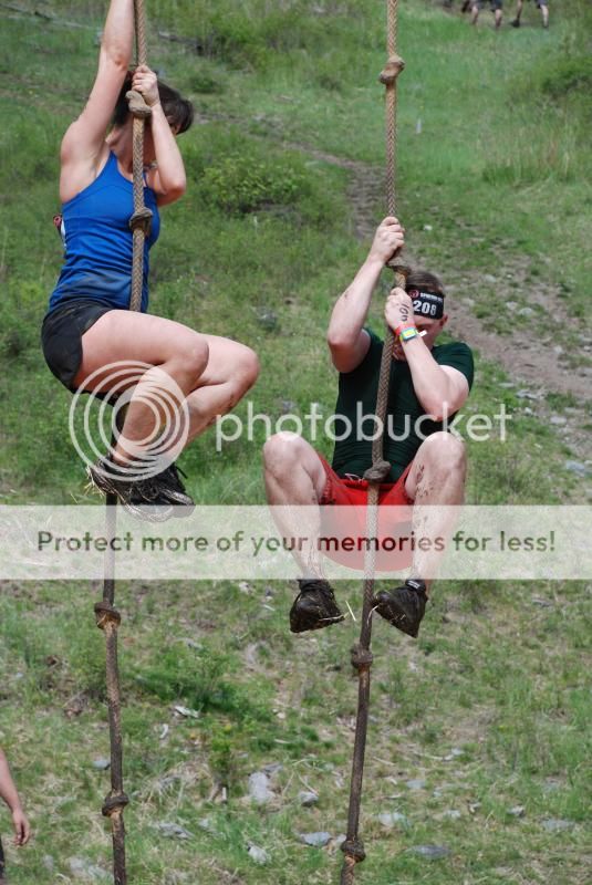 I will note about this race, if you can't do any of the obstacles, you have to drop and do 30 burpees. I was in a wave of 200 people to start at 10-15, by the time I even got to that rope, it was greased pig slippery. They ran us through a muddy spring 10 yards from those ropes. I couldn't keep my shoes on those knots, I almost dropped another nut pulling with my arms to get up there. Of course those ropes were right in front of the whole crowd too. There was a good 25 people doing burpees next to those ropes. I did make it to the top and rung the bell. Thank God.