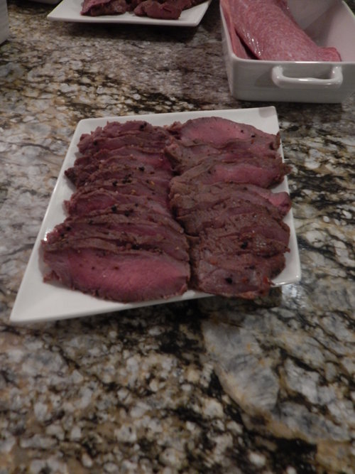 Included in the meal was antelope flat iron seared with McCormick's Roasted Garlic & Herb, and the sirloin was seared with Montreal Steak seasoning. Pre-Covid Canada goose pastrami and store bought salami rounded out the meat section of the spread. Really nice grapes, tart apple slices, various nuts and with a stroke of genius kansasson suggested we break out some of the homemade jellies to add some sweetness when desired. He brought up a blueberry/peach and also a sandplum.