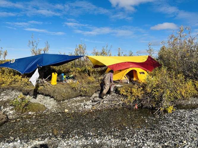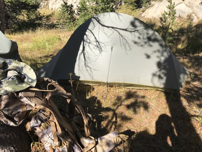 Tarp pitch from 4 nights of tarp/bivy elk camp. Got the entire sleep system down to about 6lbs with a single trekking pole, and the trekker came in handy packing out elk. Probably didn’t need the tarp. Had zero wind/rain all 4 nights to truly test it. Really like the Borah Bivy after 3 years of using it. The tarp flap in the front pulled around to a stake on the side like a little door.IMG_8228.jpeg