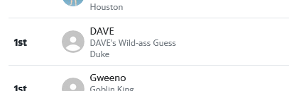 Sitting middle of the pack at 203rd. Really hoping for a Gonzaga upset this evening, but that would trash the rest of my bracket. If Arkansas takes St Johns, that will blast quite a few more brackets
