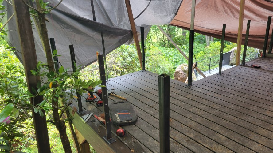 Back at it on the handrail. The patio section we did last time has been painted and the stone is in (just waiting on grout). The concrete deck took us a fair bit longer to set posts on because it was so uneven. 4 tapcons on each post has those suckers anchored very well. There's also going to be a leveling pour so the bases of the posts will be covered. The trex posts have 4 timberloks through the double band and are also very sturdy, even when they weren't welded together.