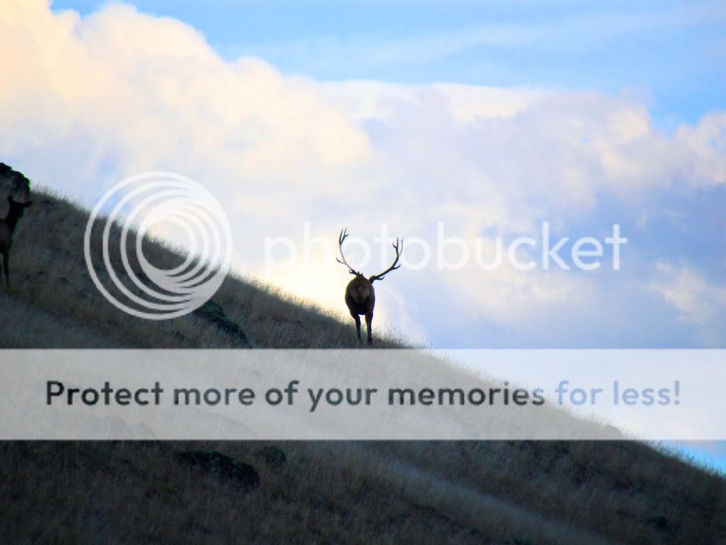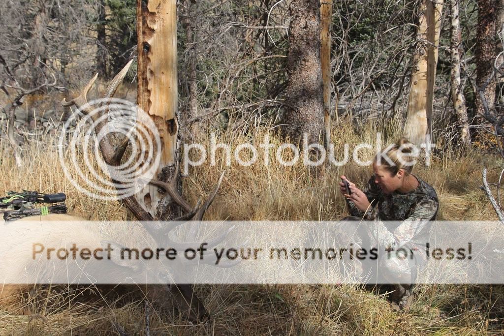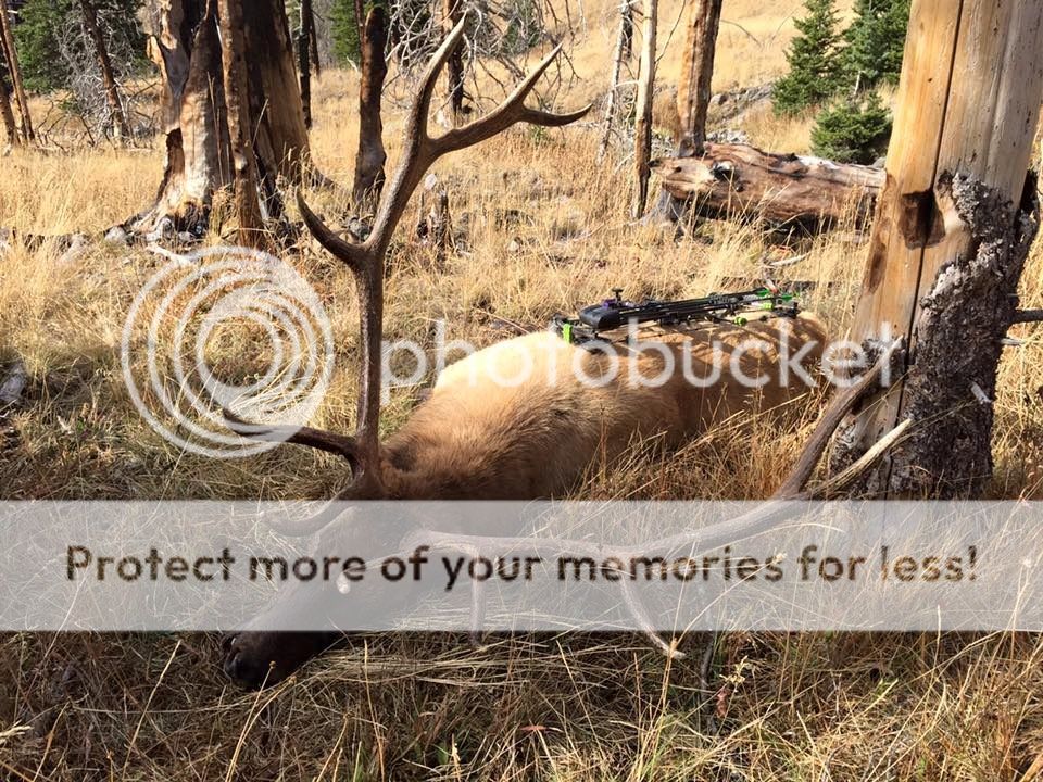 My schedule for work had been flipped and I didn't have as much time to chase elk with my bow as I would have liked, in fact I only had a 3 day window. My tag was only valid in wilderness so its a 4-6 hour horse ride into where I like to hunt. We left the trail head early the morning of the 26th and were into one of the main drainage's by noon. After taking care of the horses and setting up camp we set off on foot to go locate elk (never to hard in this area). Within 20 minutes we had found several pockets full of elk. We decided with the wind we should continue up towards the rims and hunt down on top of them. After Getting up top and started glassing we found even more elk, bulls were bugling every where and lots of good herd bulls. After glassing for close to an hour we found a giant bull pushing a few head of cows across a rocky face, in an almost impossible location to close the distance. We had went back to glassing when I caught a glimpse of something out of the corner of my eye. It was a solid bull straight below us maybe 400 yards but 600' straight off. I looked at my fiance and buddy and said heck lets just go kill that bull. after looking him over we decided it was worth a try. We slipped down an avalanche shoot and hit the creek bed he was last seen in. We slowly worked our way down towards where he was, as I rounded the corner I thought I needed to be I quickly saw a cow and 2 rag horns feeding right above me but couldn't see over the little drainage I was in. After a few minutes I was able to slip up to the edge of the creek bank under a small tree and there he was pushing a cow up towards me. There was 20 plus cows with him so my only hope was to let him come get this cow above me and sure enough just as soon as I thought that he came flying up through the rocks to grab her when I came to full draw my buddy "not being able to see cow called and he whirled around and faced me. No shot and no time to range him I stayed at full draw when he turned back towards the cow I split my 40 and 50 pin and watched my arrow disappear into him. the shot was a little back but with the angle I felt good at least one lung. To my surprise the bull took off with his cows and stopped about 100 yards out we were able to get a few pictures on the skyline and I could see the blood puddling under him. after watching him live another 20 minutes we decided to just back out and give him the night to bed down and expire. It was a very long night to say the least, I have never shot an animal and had it live more than seconds after shooting them with a bow. I was beating myself up pretty bad and my buddy and fiance kept telling me we will find him in the morning. Morning came and I was antsy to get going but my buddy said no sit tight we will make breakfast and drink coffee until it gets good and light then we will go find your bull after all we may have to take it back from a griz. I agreed and so we left camp and headed up the drainage and got to the saddle we last seen him I saw a magpie fly out of some timber below us and said half jokingly hope he is eating fresh eyeball and continued looking for blood about 20 seconds later my buddy yells up to me "hey he dead right there". Talk about music to my ears!!! After some photos, quartering and some unconvinced mules we headed back to camp to pack up and head out.