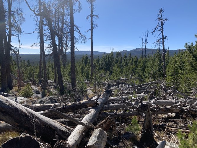 Here is where it all fell apart. My dad struggles with his hearing, even with the hearing aids he has. I tried to signal to him that there were deer behind him but he’s too far away for me to talk even with my normal voice. He assumed that they were on a farther hillside so he proceeded to stand up and turn around. As soon as the deer saw that, it was over. I didn’t have enough time to examine to buck to see if it was legal, the deadfall from the burn in this area was so bad that the antler color matched the deadfall. Tried to explain to him what he had done but it wasn’t until I called it for the morning that it finally hit him.