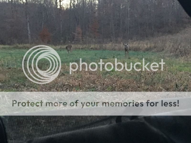 Fast forward to that afternoon. My wife was beating feet south with my oldest to try to get him there in time to hunt that evening. They were able to leave at noon, so they should be there about 3pm, plenty of time for an evening sit. However, road construction and traffic from the pending Indiana-Michigan football game turned the 3hr drive into a 4hr drive. As soon as they arrived, I asked where he wanted to hunt and he chose the ground blind. So we tossed on his coveralls, grabbed his stuff and were off! For about the first hour we didn't see or hear anything. Then I could hear something across the ROW coming down the hill. The sun was in our eyes so I couldn't get a look at what was coming, but the glimpses I did catch led me to believe they were deer. From the sound we could tell they had made it down the hill and where straight across the food plot/ROW from us. Then we saw a head! Deer! And another, and another, and one more! Four deer, all anterless were milling just off the food plot. The first entered and started feeding while Spencer got on the rifle. I asked if we should wait to see if a buck was following them and all I got was, "I'm going to shoot this deer."! It soon turned broadside and cleared the deer behind it...BANG! The deer drops. It struggles to it's feet so I put another bullet in the rifle (break action single shot) and Spencer shoots again, dropping for good. The other deer just kind of stand and stare. Spencer looks at me as says, "They aren't running off, give me more bullets!". I restrained as we have a pretty full freezer, so I explained to him we are now on 'buck patrol'. The deer finally have enough and move off.