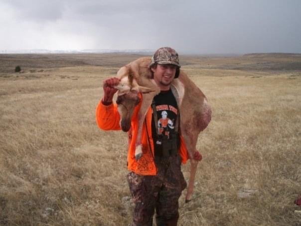 The wolf is way cool.Assorted other pack outs. The one with my mom and the sled…. It was an unseanably warm year. This is the last day of season, Sunday after Thanksgiving. We weren’t even going to go hunting. Got up in the AM and could hear cows chirping and smell elk. Snuck up behind the house and found the little raghorn.