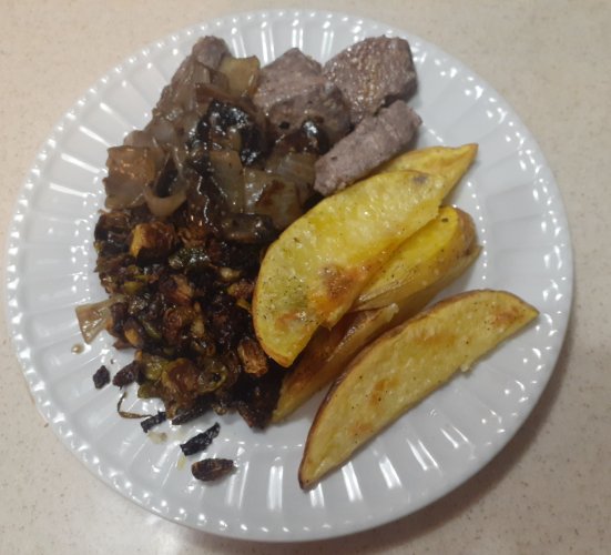Dinner tonight....medallions of whitetail loin cooked in butter and garlic in the cast iron, roasted Brussel sprouts with balsamic and bacon, onion and portobello brown gravy and roasted potatoes. Wifey (who usually doesn't go for deer) was a clean plate club member....yay!!