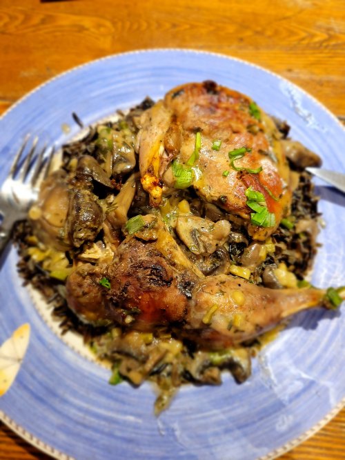First picture is black bear shank, seasoned and seared, then slow cooked with chopped yams in a beef bone broth, shredded and served over a bed of brown rice and garden veggies (green beans and red peppers). Basic seasonings include salt, black pepper, and pinch of oregano. Mostly this is what I had on hand at the time, but it turned out tasty and filling. Puppers even got a little bit.
