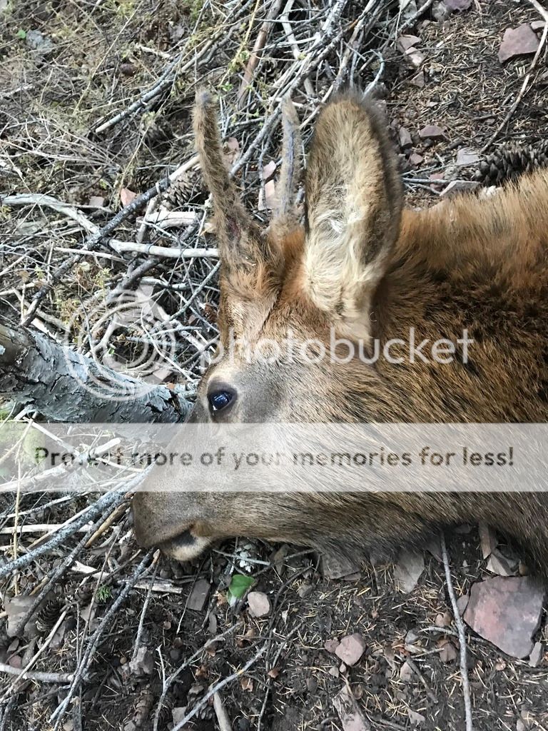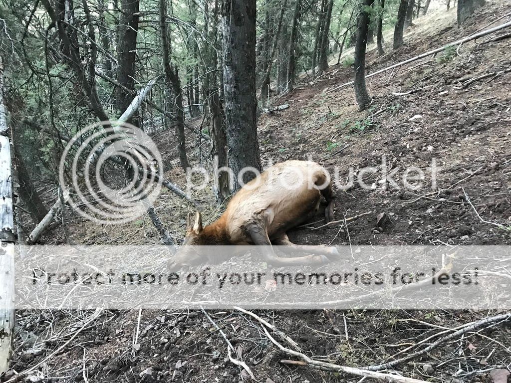 It took me 2 hours to hike back up and pick up the tracks from the night before. There was very little blood but as I entered the trees I found the elk only about 40 yards in. I was surprised to see it was a small spike.