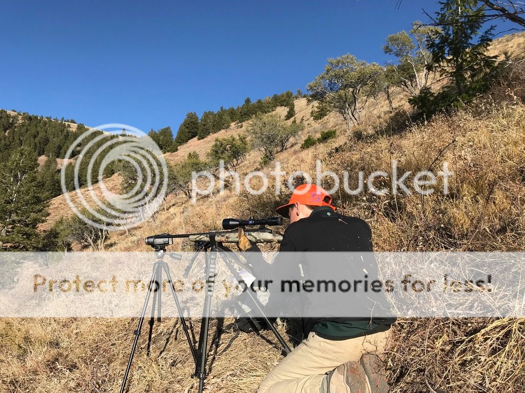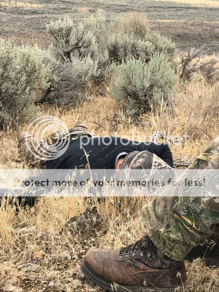 We belly crawled to the knob and the lead cow immediately smelled us and started moving off. I quickly told Asher 352 yards and to shoot the last elk that was still broadside and not moving. He shot and I knew it was a hit. The herd took off and his elk slowly walked away from us towards the trees. Asher shot a couple more times but I couldn't tell where he was hitting. Finally about 10 yards from the trees the elk layed down. It was now getting pretty dark and I couldn't tell if the elk was dead or just down. We probably should have backed out but I decided we should hike over there since we were so far from the truck. When we got over to where we thought the elk was it was pretty much dark. I couldn't see the elk and I almost stepped on it and it jumped up and ran into the trees. I knew I had screwed up. I knew how far an elk could go when bumped.