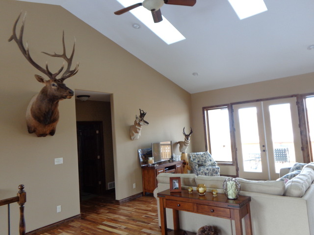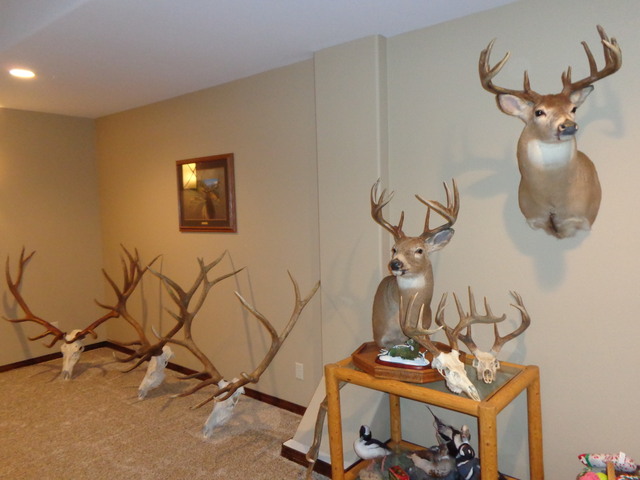 Our 'agreement' is that I get at least one room in any house to put taxidermy. My elk couldn't fit where she wanted it so she found a place for it where it would fit. Since my garage is not climate controlled, I will not put anything with hide on there.
