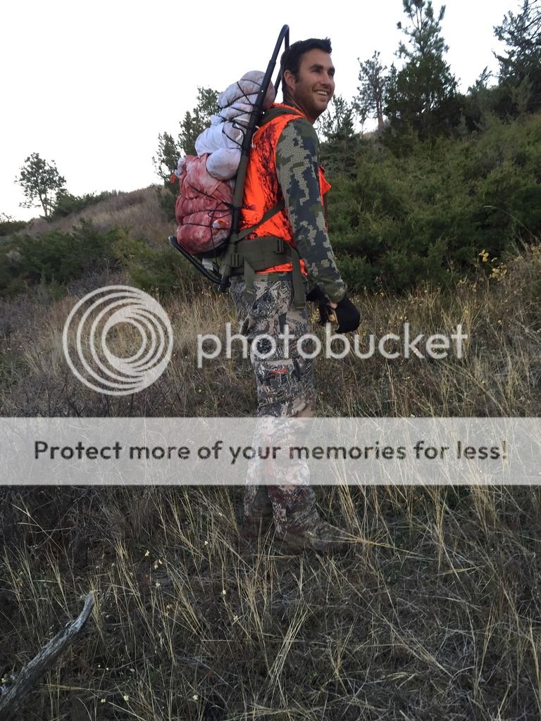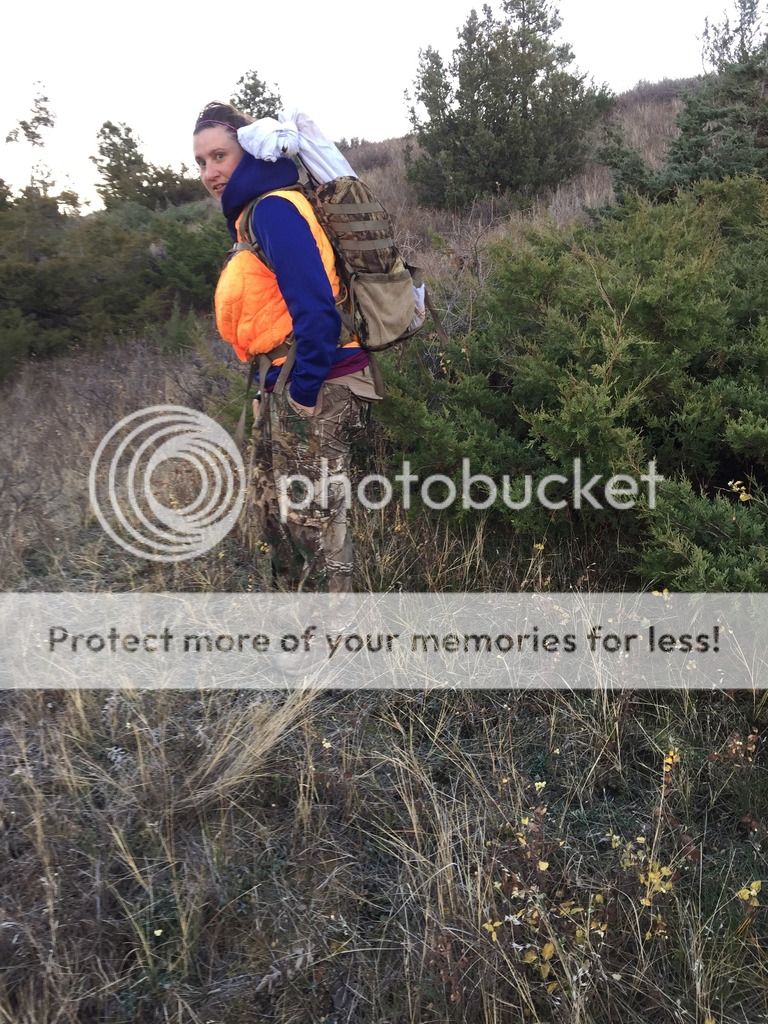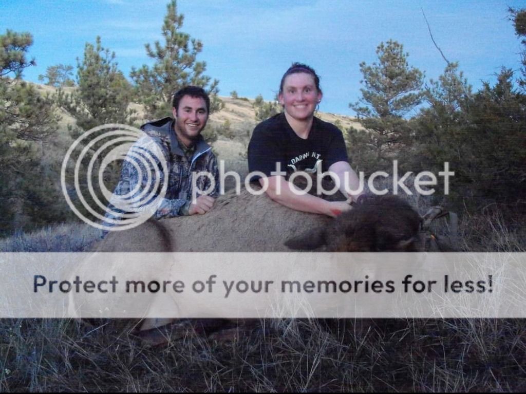 Pretty proud of the wife. She decided for her first elk she wanted to pack it out on her back instead of using our pack stock we have. She busted her ass to fill her cow tag this year and didn't complain one bit when we had to pack it right at 2 miles. I may have gotten the "go to hell" look from her once or twice though. 7mm-08 140 grain accubond 398 yards. One shot and elk ran about 40 yards and tipped over. Would have liked to have closed the distance farther but we were losing light and there was mule deer in between us and the elk. Very thankful to have a freezer full of elk meat again this year. Now hopefully I can fill my tag this coming weekend in the Crazies. I think I have created a monster though as she now has been bitten by the elk bug bad