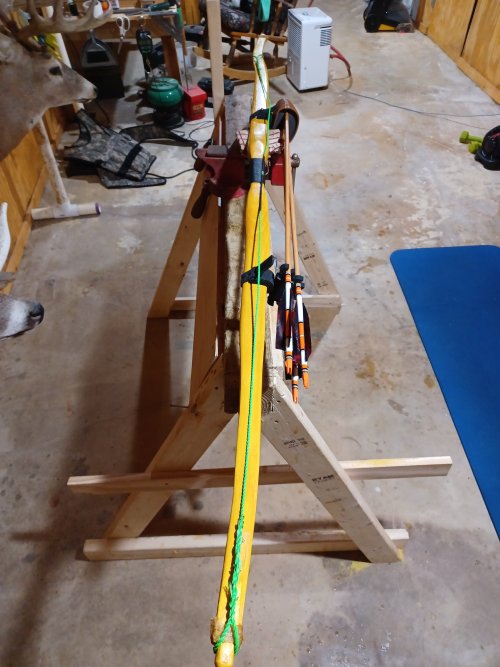 Quick project involving bent wood and scraps. I'm planning on hunting with my dad's old recurve this season and I bought a 2-part quiver that straps onto the upper and lower limbs. But I was having trouble with the upper part sliding every time I put an arrow back in. SO I thought I would just connect the two parts, but I knew I needed to bend the wood and I had some scraps of poplar that were about 1/16" thick. With a scrap of 3/4" plywood and some epoxy it all came together.