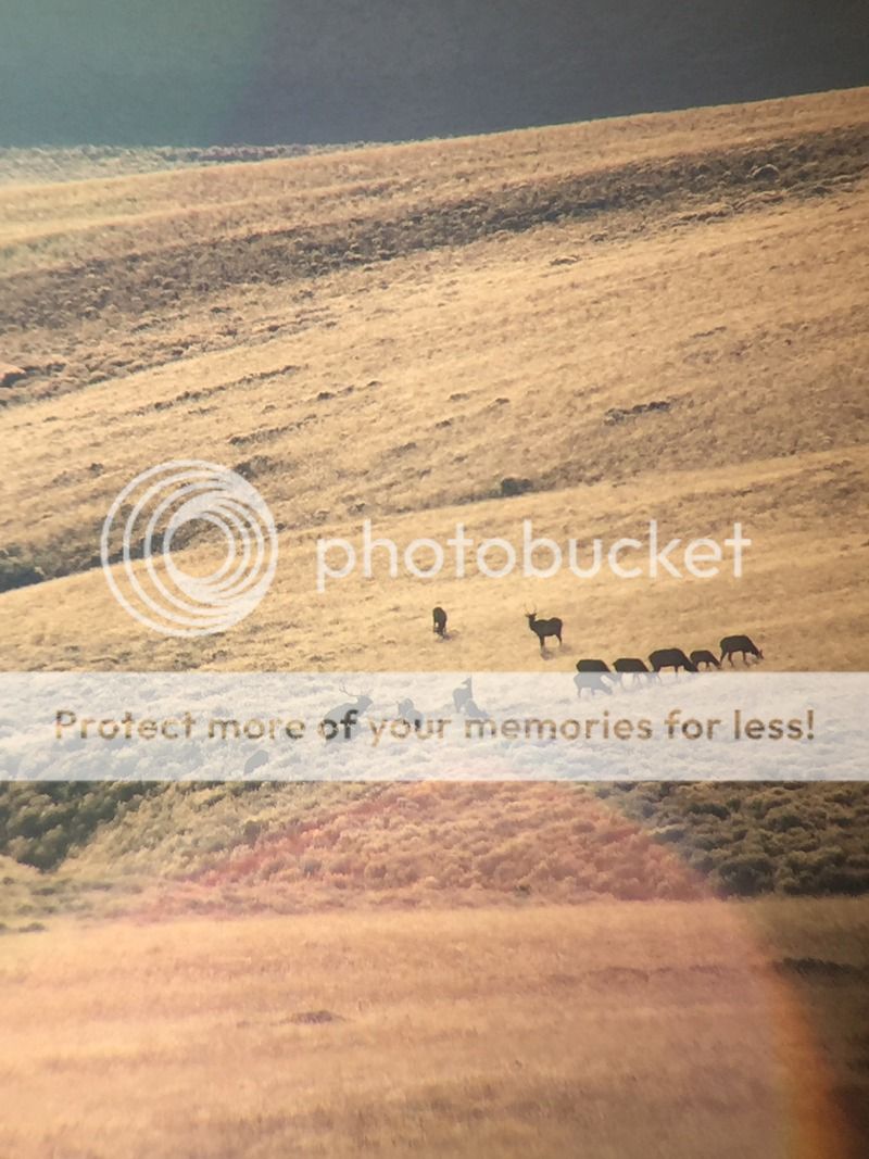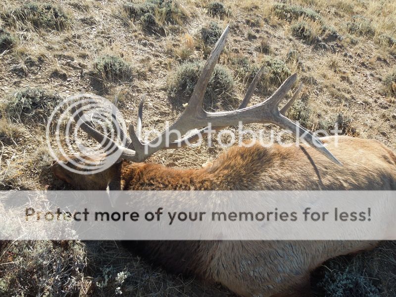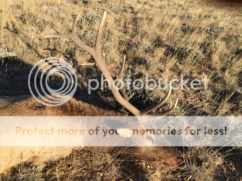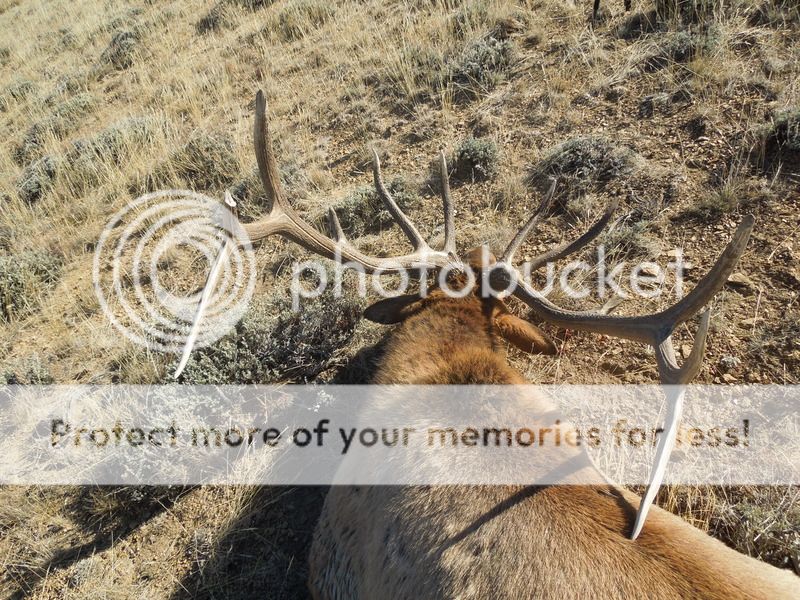 They closed the distance to just under 400yds, but I decided to pass. I couldn't believe I was doing it as I have ate way more elk tags than I've filled, but I did pass. After they moved off I turned back to the herd somewhere in front of me. I couldn't see anything for a few minutes, then 4 bulls trotted out from the drainage in front of me and headed to the left. I quick check with the binos revealed that I wasn't going to shoot any of these bulls, but I ranged them as I figured the herd would take the same route. They where 367yds away, just past the edge of my comfort zone. They milled around on the hill for a bit when a bugle ripped out over the hill in front of me. Three of the bulls took off left and the spike came trotting down the hill my way! Not much later I herd another bugle than a few cow calls. I knew they were very far, but I couldn't see them. Then...hoof beats! I could hear hoof beats coming my way! I got the rifle up on the sticks and tried to not get too excited. Then over the top of the hill about 60yds away came first the cows. As they fully topped the hill the locked up as I was caught out in the open. Just as I was getting the rifle up the bull trailing them bugled. He come up the hill, nudged a calf with his nose and ripped off another bugle as I had him in the scope. I saw what I thought were good fronts and long beams. Once the calf cleared I put the crosshairs on the front of his chest...BOOM! The heard takes off to my left. The bull follows for about 10 yards then starts to peel off to the right. I hurriedly tried a second shot that was a clean miss. My nerves and adrenaline were way up! The bull stumbled a few steps and stopped. I was able to compose myself and dropped him with a shot to the shoulder. My second bull ever was down!